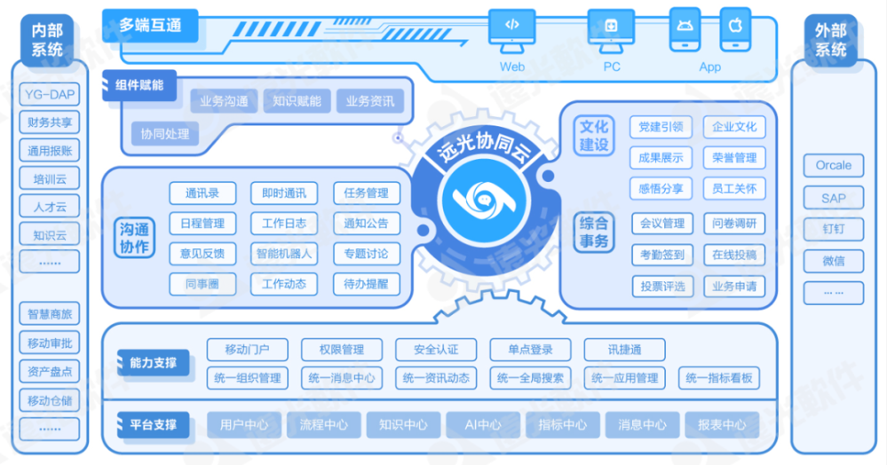 以移動端協(xié)同為核心,融合內(nèi)外部應(yīng)用,打造智能化辦公平臺,構(gòu)建社交化、移動化、云化、智能化的協(xié)作創(chuàng)新生態(tài)圈。
