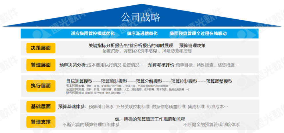 管理支撐層面:預(yù)算管理從本質(zhì)上是“一把手”工程,需要公司預(yù)算管理委員會(huì)、預(yù)算管理辦公室等預(yù)算管理組織的大力保障,需要制定健全的預(yù)算管理制度、統(tǒng)一明確的預(yù)算工作規(guī)范及流程;