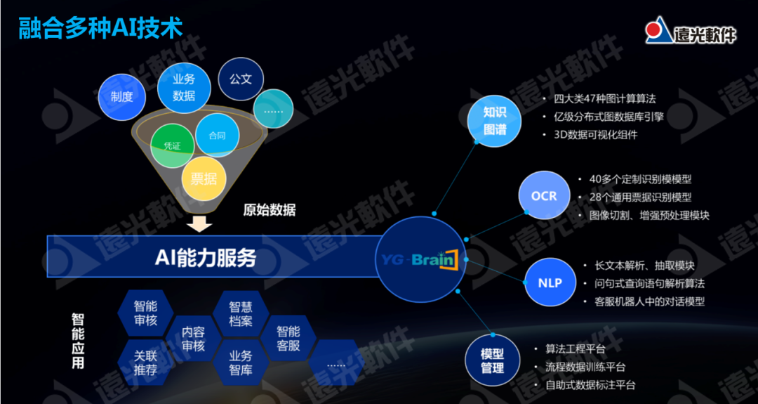 遠(yuǎn)光軟件積累了大量新型技術(shù)的開(kāi)發(fā)能力,如大數(shù)據(jù)分析、AI、區(qū)塊鏈以及自主研發(fā)智能硬件的能力,通過(guò)YG-RPA云平臺(tái)作為連接器,與新型智能化技術(shù)進(jìn)行連接、集成,最終形成以RPA機(jī)器人為抓手的智能化解決方案。