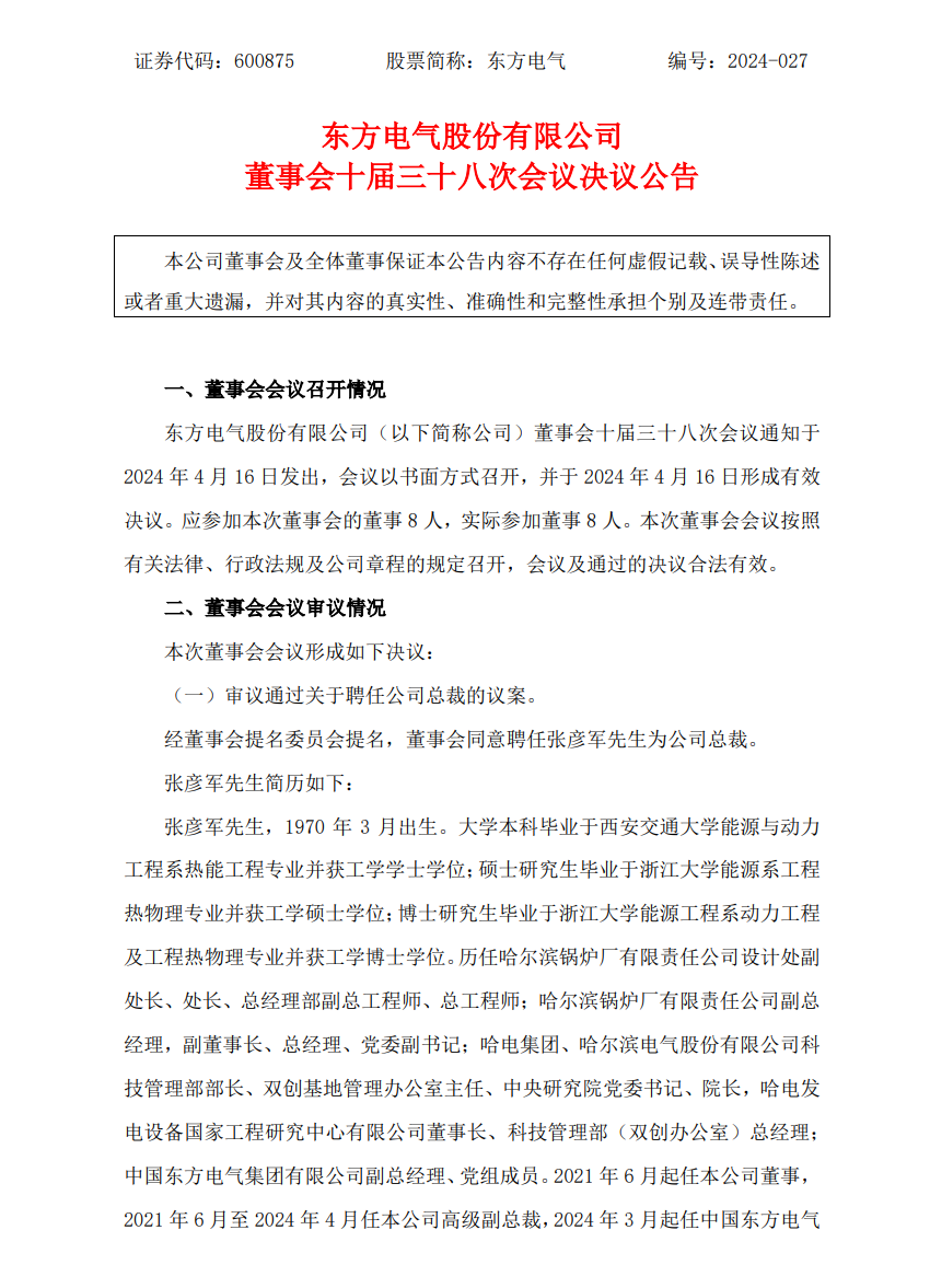4月16日,東方電氣發(fā)布公告稱,公司董事會(huì)十屆三十八次會(huì)議通知于4月16日發(fā)出,會(huì)議以書面方式召開,并于4月16日形成有效決議。本次董事會(huì)審議通過關(guān)于聘任公司總裁的議案,同意聘任張彥軍先生為公司總裁。