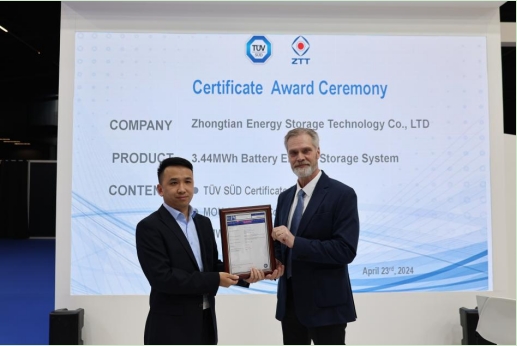 大會期間,中天科技發(fā)布了大型儲能、高壓直流海纜、大容量輸電三大領域的下一代新產(chǎn)品及系統(tǒng)解決方案,為全球能源高效轉(zhuǎn)型提供了技術裝備支撐。發(fā)布會上,中天儲能科技有限公司獲得TUV南德液冷儲能系統(tǒng)認證并達成戰(zhàn)略合作。