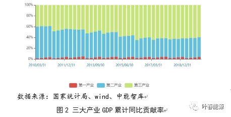 分產業(yè)看,10余年來,隨著我國經濟結構的轉型,三大產業(yè)對GDP的貢獻率發(fā)生明顯變化。2010至2019年,第三產業(yè)GDP貢獻率由39.7%上升至59.4%,增加接近20個百分點;第二產業(yè)GDP貢獻率由58.6%降至36.8%,下降21.8個百分點。三大產業(yè)貢獻率格局基本穩(wěn)定,第三產業(yè)成為拉動GDP的生力軍,其占比上升5.7個百分點;二產占比下降6.6個百分點。2019年,第三產業(yè)和城鄉(xiāng)居民生活用電量對全社會用電量增長的貢獻率達51.0%,比上年提高11.1個百分點,其中第三產業(yè)貢獻率比上年提高10.1個百分點,是支撐全社會用電量增長的主要動力。