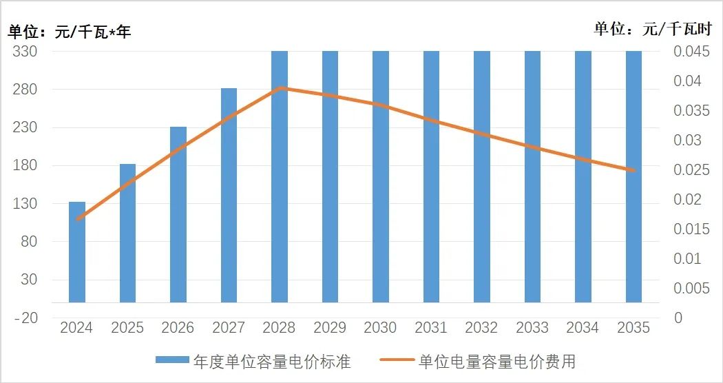 圖3 年度單位容量電價標準及單位電量容量電價費用(按趨勢預(yù)估測算)
