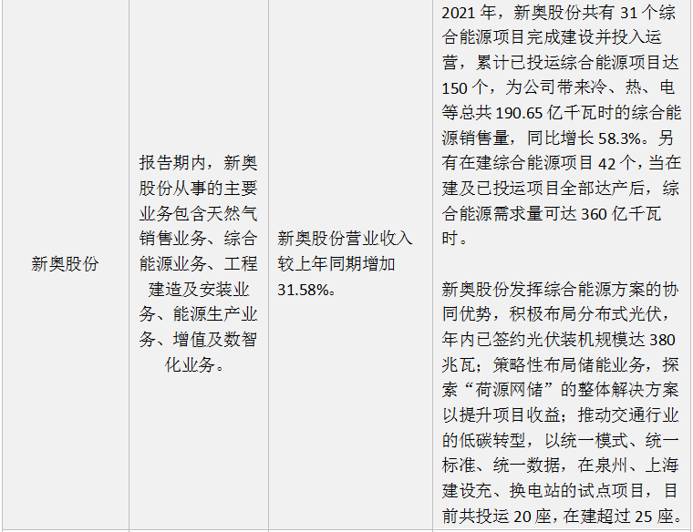 新奧股份2021年年度報(bào)告顯示,報(bào)告期內(nèi),公司營(yíng)業(yè)收入較上年同期增加31.58%,主要是公司所屬子公司天然氣業(yè)務(wù)(零售、批發(fā)、直銷)氣量增加、單價(jià)上漲,以及綜合能源業(yè)務(wù)快速增長(zhǎng)所致。在綜合能源業(yè)務(wù)方面,新奧股份重點(diǎn)開發(fā)低碳園區(qū)、低碳工廠、低碳建筑、低碳交通四大類客戶,以綠色低碳整體解決方案切入,大力發(fā)展終端節(jié)能、工藝優(yōu)化、能源設(shè)施托管運(yùn)營(yíng)等用能側(cè)服務(wù)業(yè)務(wù)。