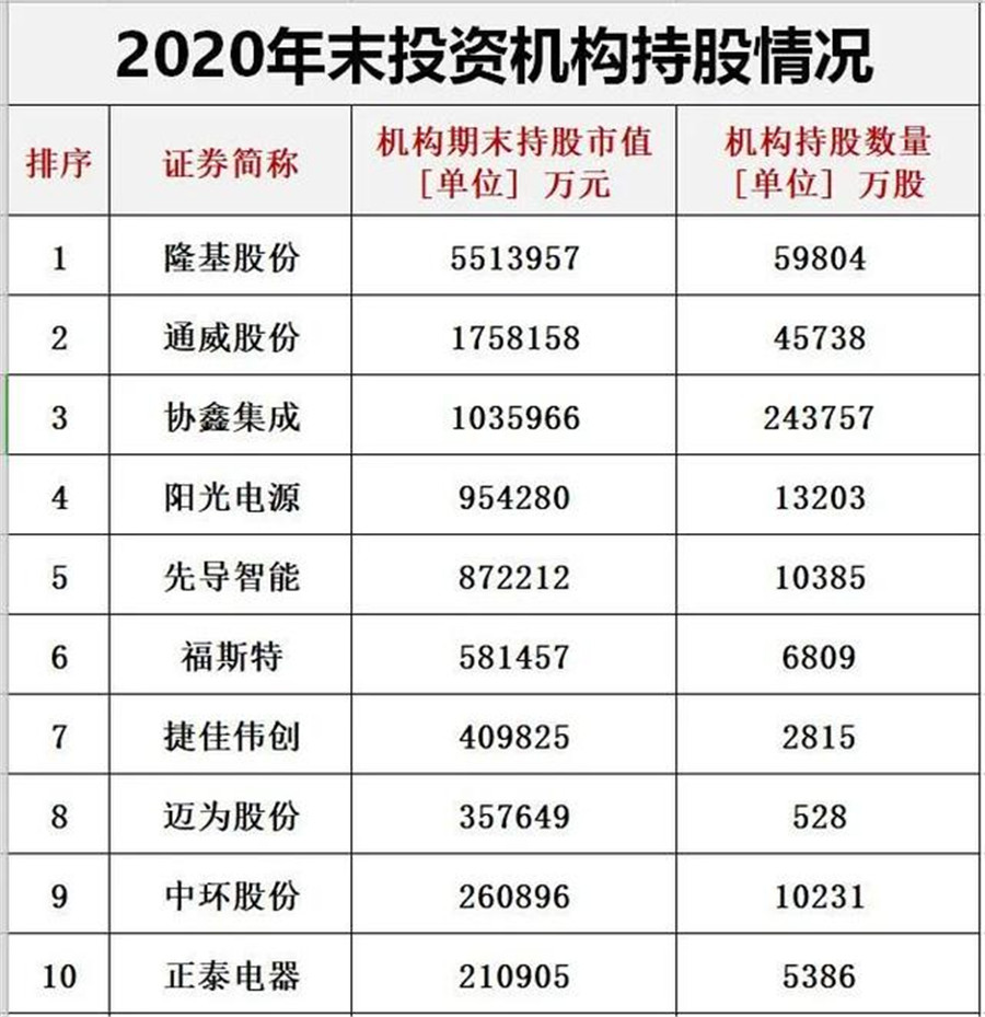 但近期黑鷹光伏團(tuán)隊(duì)做了另一維度相關(guān)統(tǒng)計(jì)分析,結(jié)果與光伏產(chǎn)業(yè)層面一片欣欣向榮的大趨勢并不完全“呼應(yīng)”。我們發(fā)現(xiàn):2020年第四季度,機(jī)構(gòu)投資者巨額減持光伏概念股,具體而言,第四季度末較第三季度末投資機(jī)構(gòu)持股倉位減少了1727350萬股!(后附2020年末投資機(jī)構(gòu)持股光伏排行榜)。