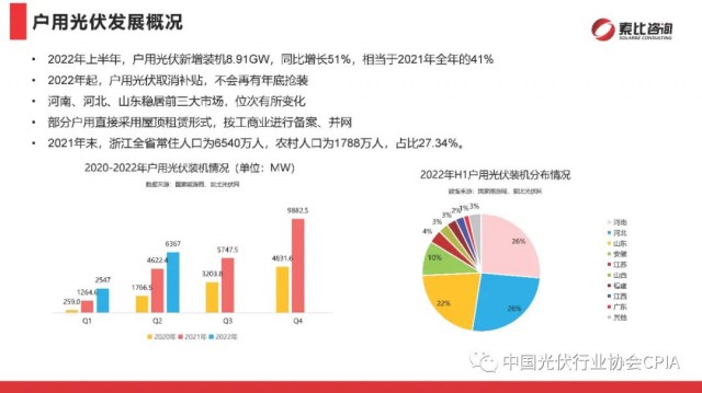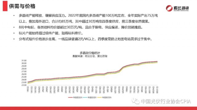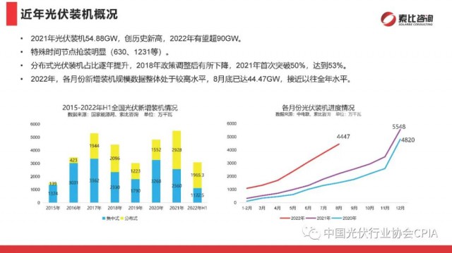 2022年9月27日,在中國(guó)光伏行業(yè)協(xié)會(huì)的指導(dǎo)和國(guó)內(nèi)領(lǐng)先的分布式戶用企業(yè)支持下,由索比光伏網(wǎng)主辦的“2022年中國(guó)戶用光伏品牌大會(huì)暨中東部省份分布式項(xiàng)目開發(fā)研討會(huì)”在浙江寧波召開。索比光伏網(wǎng)副主編尹也澤對(duì)光伏供應(yīng)鏈與分布式應(yīng)用市場(chǎng)進(jìn)行了回顧展望。尹也澤副主編分析,整體看,今年全年全國(guó)光伏發(fā)電新增裝機(jī)有望超過(guò)90GW,其中分布式光伏仍將占據(jù)“半壁江山”。