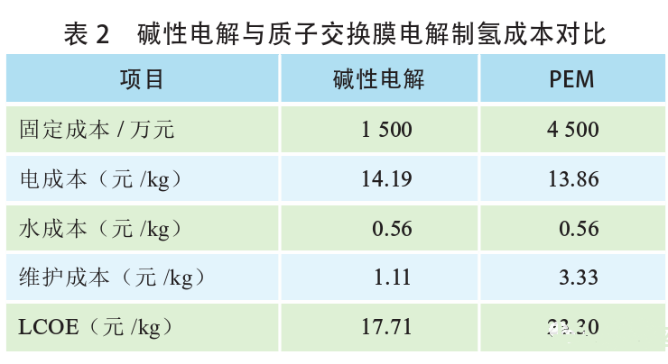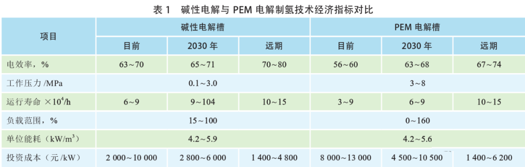 我國(guó)以可再生能源(如風(fēng)電、光伏、水電)進(jìn)行電解水制氫,電價(jià)控制在0.25元/kWh以下時(shí),制氫成本具有相對(duì)經(jīng)濟(jì)性(15.3~20.9元/kg)。堿性電解與PEM電解制氫技術(shù)經(jīng)濟(jì)指標(biāo)見(jiàn)表1。