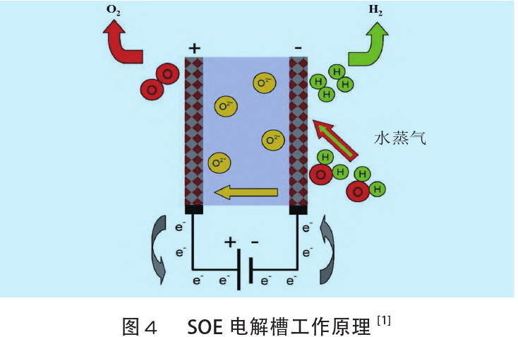 固體氧化物電解槽(SOE)利用高溫水蒸氣(600~900℃)電解,效率高于堿性電解槽和PEM電解槽。20世紀(jì)60年代,美國(guó)和德國(guó)就開(kāi)始進(jìn)行SOE高溫水蒸氣的相關(guān)研究。SOE電解槽的工作原理如圖4所示。循環(huán)氫氣和水蒸氣從陽(yáng)極進(jìn)入反應(yīng)系統(tǒng),水蒸氣在陰極電解成氫氣,陰極產(chǎn)生的O2–通過(guò)固體電解質(zhì)移動(dòng)到陽(yáng)極,重新結(jié)合形成氧氣并釋放電子。