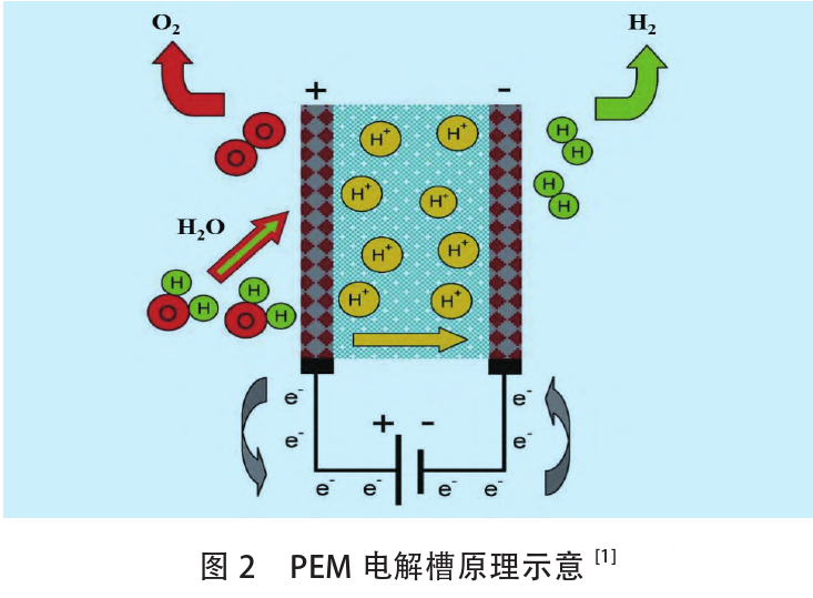 陽(yáng)極、陰極和膜組構(gòu)成膜電極組件(MEA),電極通常由鉑或銥等貴金屬組成。在陽(yáng)極,水被氧化產(chǎn)生氧氣、電子和質(zhì)子。在陰極,陽(yáng)極產(chǎn)生的氧氣、電子和質(zhì)子通過(guò)膜循環(huán)到陰極,被還原產(chǎn)生氫氣。PEM電解槽的原理如圖2所示。