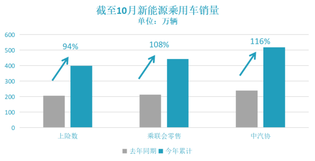 終端統(tǒng)計(jì)的上險(xiǎn)數(shù)更為直接反映了市場(chǎng)狀況,1-10月總上險(xiǎn)新能源乘用車399.47萬輛,同比增幅也達(dá)到了94%。