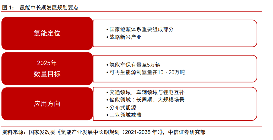 行業(yè)中長期規(guī)劃對投資而言主要有三大核心要點,包括氫能定位、未來發(fā)展目標以及應用方向。