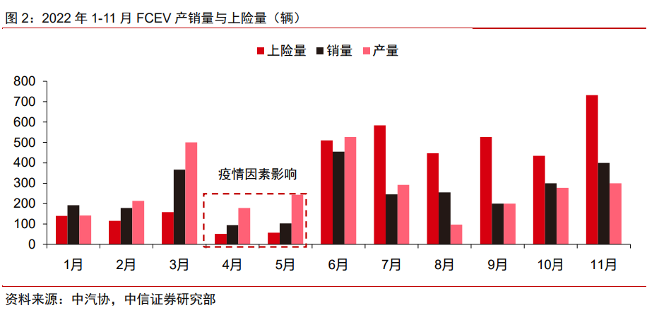 根據(jù)中汽協(xié)以及中信保數(shù)據(jù),2022年前11月FCEV產(chǎn)量為2969輛,銷量為2789輛,上險(xiǎn)總數(shù)為3755輛。2022年上半年產(chǎn)量一直大于銷量,主要系2021年下半年確定燃料電池示范城市群政策,業(yè)內(nèi)熱情與預(yù)期較高。