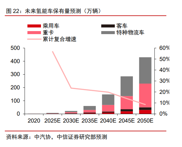 我們預(yù)計,隨著國內(nèi)技術(shù)進(jìn)步以及規(guī)?;?yīng)的疊加,未來國內(nèi)氫能車成本或有持續(xù)的降本,目前氫能重卡的成本約140萬元/輛,預(yù)計2025年可以降至100萬元/輛,至2030年可降至80萬元/輛,基本可以實現(xiàn)與鋰電、柴油相應(yīng)車型的平價。