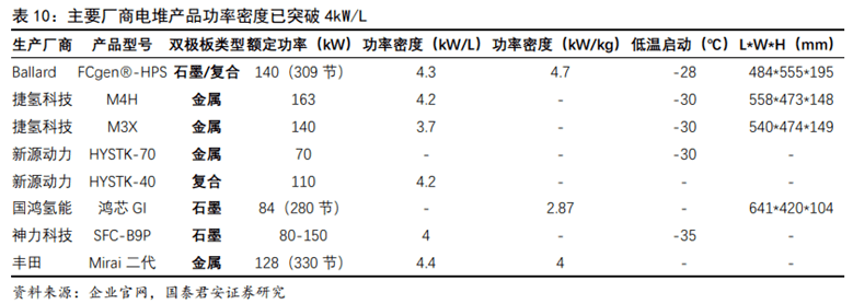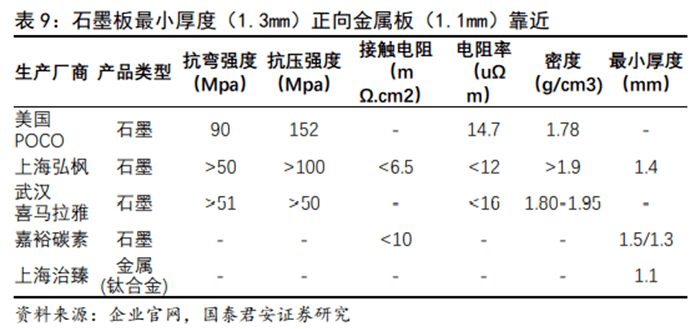 石墨板適應(yīng)需求趨于薄型化,乘用車為金屬板帶來機(jī)遇。石墨板:由于其高耐腐蝕性、高耐久性,以及相對較低的技術(shù)壁壘,率先實(shí)現(xiàn)國產(chǎn)化,在對體積較不敏感而對耐久性敏感的特種車、商用車領(lǐng)域示范應(yīng)用。然而,石墨雙極板的制作周期長、機(jī)械性能差、加工難度大、制作成本高等劣勢也不可忽視。市場已有越來越多的企業(yè)成功開發(fā)出超薄超精細(xì)石墨雙極板,提前突破了國家制定2025年前單組石墨雙極板厚度1.5mm的要求,功率密度開始接近豐田第一代金屬雙極板的水平。金屬板:抗腐蝕性差,壽命過短是其應(yīng)用的阻礙,然而隨著涂層工藝的持續(xù)進(jìn)步與突破,其有望實(shí)現(xiàn)和石墨板相同的使用壽命。豐田汽車公司率先在旗下Mirai燃料電池汽車上使用金屬雙極板和涂層,解決了腐蝕、成本和導(dǎo)電等一系列問題。憑借其機(jī)械性能優(yōu)異、高體積功率密度、成本低廉且易批量生產(chǎn)等優(yōu)勢,金屬雙極板將在乘用車規(guī)?;瘧?yīng)用的進(jìn)程中實(shí)現(xiàn)突破。