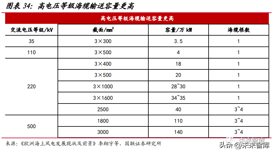海纜對(duì)耐腐蝕、抗拉耐壓、阻水防水等性能要求更高。與陸纜相比,海纜鋪設(shè)于 海底,水下情況復(fù)雜,需要承受較大水壓,因此必須具有良好的阻水和機(jī)械性能,防 止水分滲透導(dǎo)致海纜發(fā)生故障,也需要具備良好的機(jī)械性能為、防止船只錨害和洋流 沖刷,此外海纜還需具有防腐蝕、防海洋生物的能力,保障壽命。海纜趨勢(shì)一:離岸距離、大兆瓦風(fēng)機(jī)驅(qū)動(dòng)使用高電壓等級(jí)海纜。過(guò)去國(guó)內(nèi)已并網(wǎng) 的海上風(fēng)電項(xiàng)目離岸距離較近(30km 以內(nèi)),均采用交流海纜送出方式,但隨著風(fēng)機(jī) 大型化、項(xiàng)目向深遠(yuǎn)海延伸過(guò)去,35kV、110kV 交流海纜受輸送容量限制,同時(shí)鋪設(shè) 海纜根數(shù)多對(duì)海底走廊有很高占用,輸電損耗也較大。同輸電功率的情況下,電壓越高電流就越小,高壓輸電能減少輸電時(shí)的電流從而降低因電流產(chǎn)生的熱損耗和降低遠(yuǎn) 距離輸電的材料成本。國(guó)內(nèi)目前主流交流海纜電壓等級(jí)為 220kV,采用單回三芯結(jié)構(gòu), 輸電能力在 18~35 萬(wàn) kW,高電壓等級(jí)(更高 220kV、500kV)輸電能力顯著提高。