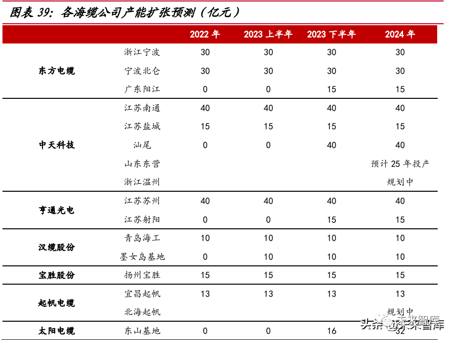 疫情因素減弱,疊加海纜較高的毛利率,海纜企業(yè)擴(kuò)大產(chǎn)能的動(dòng)機(jī)較強(qiáng)。東方電 纜陽(yáng)江基地、中天科技(維權(quán))汕尾基地和亨通光電射陽(yáng)基地 2023 年下半年投產(chǎn),預(yù)計(jì)分別 擴(kuò)大產(chǎn)能 15 億、40 億和 15 億;漢纜股份墨女島已建成,投產(chǎn)時(shí)間預(yù)計(jì)在 23 年初, 擴(kuò)產(chǎn)可達(dá) 10 億;太陽(yáng)電纜正在建設(shè)東山海纜生產(chǎn)基地,產(chǎn)能可達(dá) 32 億。