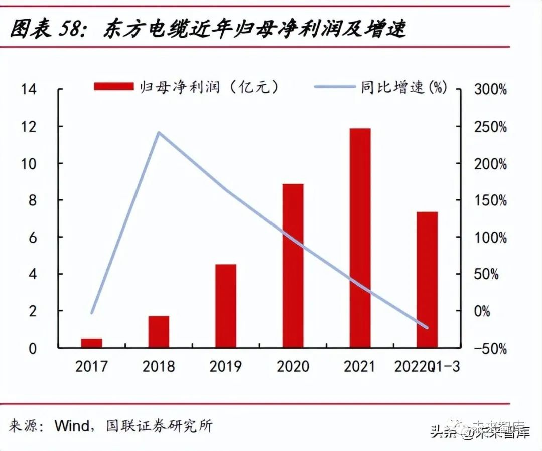 全國(guó)海纜龍頭,營(yíng)收利潤(rùn)同步增長(zhǎng)。公司作為國(guó)內(nèi)電線電纜龍頭企業(yè),業(yè)務(wù)全面 覆蓋陸纜系統(tǒng)、海纜系統(tǒng)、海洋工程三大產(chǎn)品領(lǐng)域,并在高端線纜專業(yè)領(lǐng)域?qū)崿F(xiàn)多項(xiàng) 技術(shù)突破。2022 年前三季度,公司營(yíng)業(yè)收入同比下滑 1.88%,歸母凈利潤(rùn)同比下滑 23.43%, 主要由于國(guó)內(nèi)海風(fēng)搶裝潮的結(jié)束及疫情影響需求,部分海纜項(xiàng)目交付延后,導(dǎo)致主營(yíng) 業(yè)務(wù)中海纜系統(tǒng)收入有所下滑。