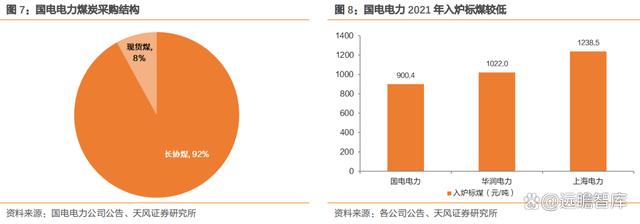此外,上市公司國電電力充分利用集團優(yōu)勢,長協(xié)煤占比高,有效緩解燃料成本壓力。公司充分利用國家能源集團“煤電路港航”一體化產(chǎn)業(yè)協(xié)同優(yōu)勢,提升內(nèi)部優(yōu)質(zhì)長協(xié)煤炭資源比例及兌現(xiàn)率。2021 年,公司共采購煤炭 1.91 億噸,其中長協(xié)煤總量 1.75 億噸,占比92%。公司把握采購結(jié)構(gòu)和節(jié)奏,優(yōu)化采購煤種和熱值,深入開展精細化配煤摻燒;在燃料智能化、智能發(fā)電、電力安全生產(chǎn)標(biāo)準(zhǔn)化等方面,開展了很多前沿探索,積累了很多成果經(jīng)驗,管控水平行業(yè)領(lǐng)先。從 2021 年入爐標(biāo)煤來看,公司僅為 900.4 元/噸,明顯處于行業(yè)較低水平。
