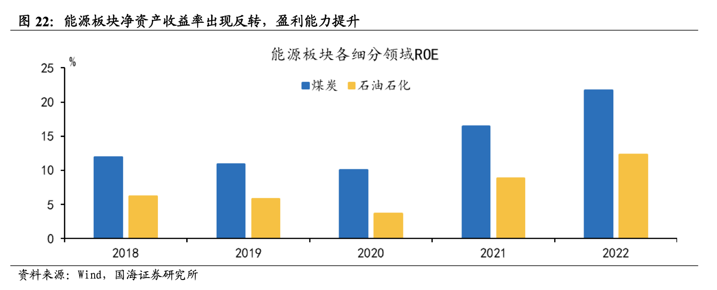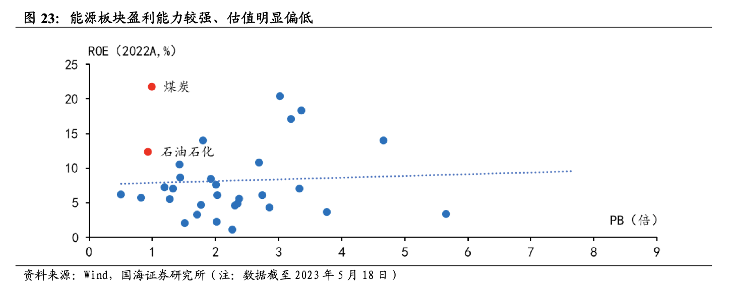 國(guó)海證券6月8日研報(bào)表示,能源板塊中上市公司擁有較為優(yōu)質(zhì)的基本面和偏低的市場(chǎng)估值,處于優(yōu)質(zhì)資產(chǎn)被低估的狀態(tài)。根據(jù)國(guó)海證券6月8日研報(bào)測(cè)算,截止到5月24日,石油石化、煤炭、公用事業(yè)2022年全年的ROE分別為12.32%、21.74%、5.59%,盈利能力較強(qiáng),且PB十年分位分別為 8.3%、35.9%、37.8%,能源是優(yōu)質(zhì)資產(chǎn)被低估的主要領(lǐng)域,調(diào)整過(guò)后仍具備性?xún)r(jià)比。