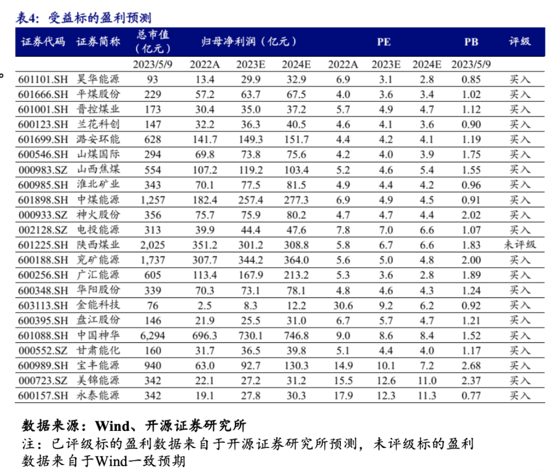根據(jù)開(kāi)源證券梳理,煤企四種能源轉(zhuǎn)型途徑分別為,高分紅兼具高彈性的雙重受益標(biāo)的(前四再疊加高成長(zhǎng)):山西焦煤、廣匯能源、兗礦能源、潞安環(huán)能、山煤國(guó)際;經(jīng)濟(jì)復(fù)蘇及冶金煤彈性受益標(biāo)的:平煤股份、淮北礦業(yè)(含轉(zhuǎn)債)、神火股份(煤鋁);穩(wěn)健高分紅受益標(biāo)的:中國(guó)神華、陜西煤業(yè);中特估預(yù)期差最大受益標(biāo)的:中煤能源;能源轉(zhuǎn)型受益標(biāo)的:華陽(yáng)股份、美錦能源(含轉(zhuǎn)債)、電投能源、永泰能源。