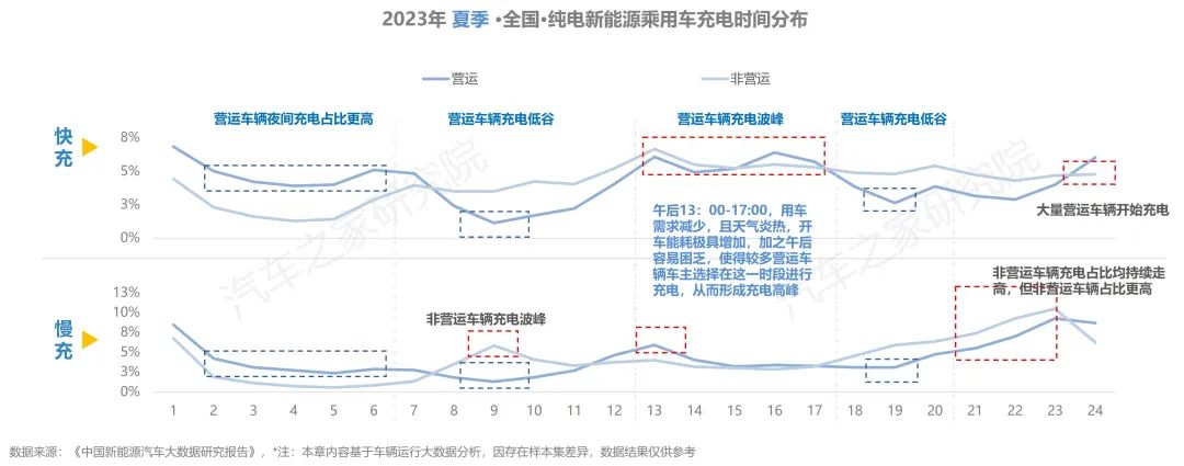 從充電開始時間上看,營運車輛在充電時,快充與慢充的波峰、波谷時間基本一致。早9時與晚19時是營運車輛充電的低谷,同時夜間充電比例更高。此外,由于午后用車需求減少,且夏季天氣炎熱,開車能耗大幅增加,加之午后容易困乏,使得較多車主選擇在下午13-17時進(jìn)行快充補(bǔ)能,從而形成充電高峰。當(dāng)選擇慢充進(jìn)行補(bǔ)能時,非營運車輛第一次充電高峰出現(xiàn)在上午9時而后快速回落,第二次是從19時開始一路攀升,至23時到達(dá)頂點,開始充電時間與營運車輛相比明顯更早。