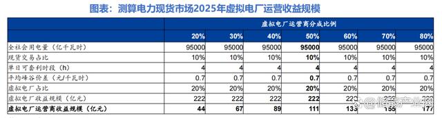 測(cè)算得到,通過(guò)電力現(xiàn)貨市場(chǎng)獲利模式下,當(dāng)虛擬電廠運(yùn)營(yíng)商分成比例為50%時(shí),虛擬電廠2025年運(yùn)營(yíng)市場(chǎng)規(guī)模為111億元。