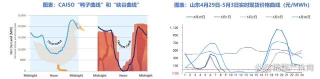 國(guó)內(nèi)以山東為代表的部分省份同樣有明顯的填谷需求。山東裝機(jī)結(jié)構(gòu)與CAISO相似,截至22年底,光伏裝機(jī)占比達(dá)到22.5%。在2023年五一假期期間,山東省內(nèi)用電負(fù)荷下降約15%,引發(fā)連續(xù)負(fù)電價(jià)現(xiàn)象。值得注意的是,4月29日-5月1日現(xiàn)貨價(jià)格曲線形狀類(lèi)似鴨子曲線,期間10時(shí)-15時(shí)負(fù)電價(jià)出現(xiàn)尤為頻繁,而該時(shí)段為光伏發(fā)電高峰。