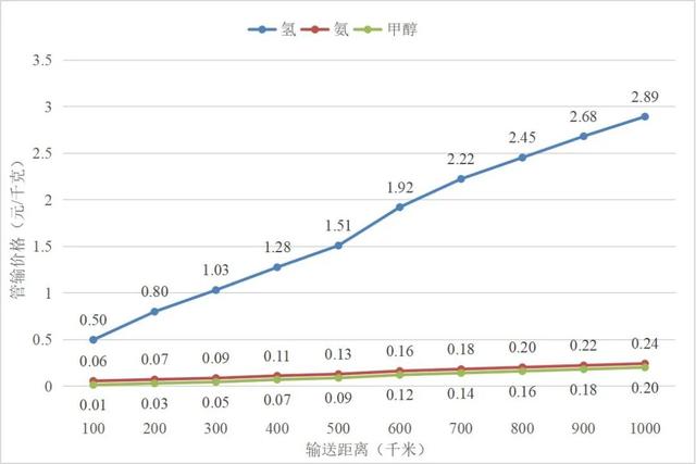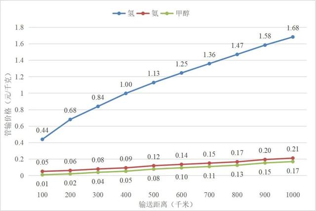 中期階段氫基能源長距離管輸價格與輸送距離的關系圖
