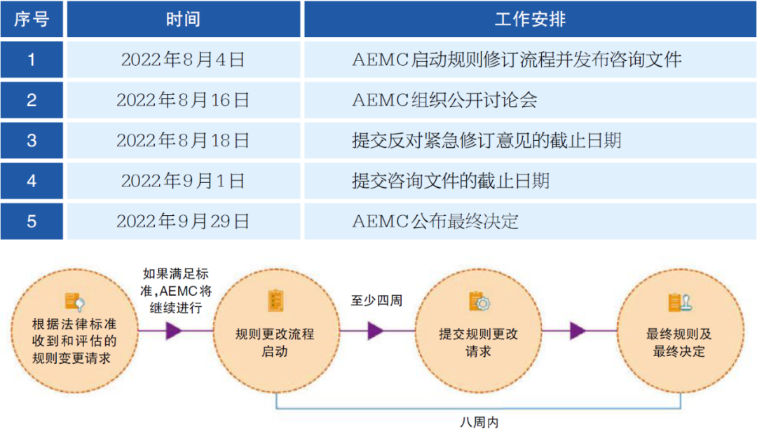 7月21日,AEMC發(fā)布《啟動和加快修訂APC規(guī)則修訂意向的預(yù)先通知》。8月4日,AEMC啟動了APC規(guī)則緊急修訂流程,公開發(fā)布咨詢文件以便利益相關(guān)者參與其中。按照法律規(guī)定,緊急修訂流程下只有一輪咨詢,并且AEMC必須在規(guī)則修訂流程開始后的八周內(nèi)(最晚9月29日)公布其最終決定。