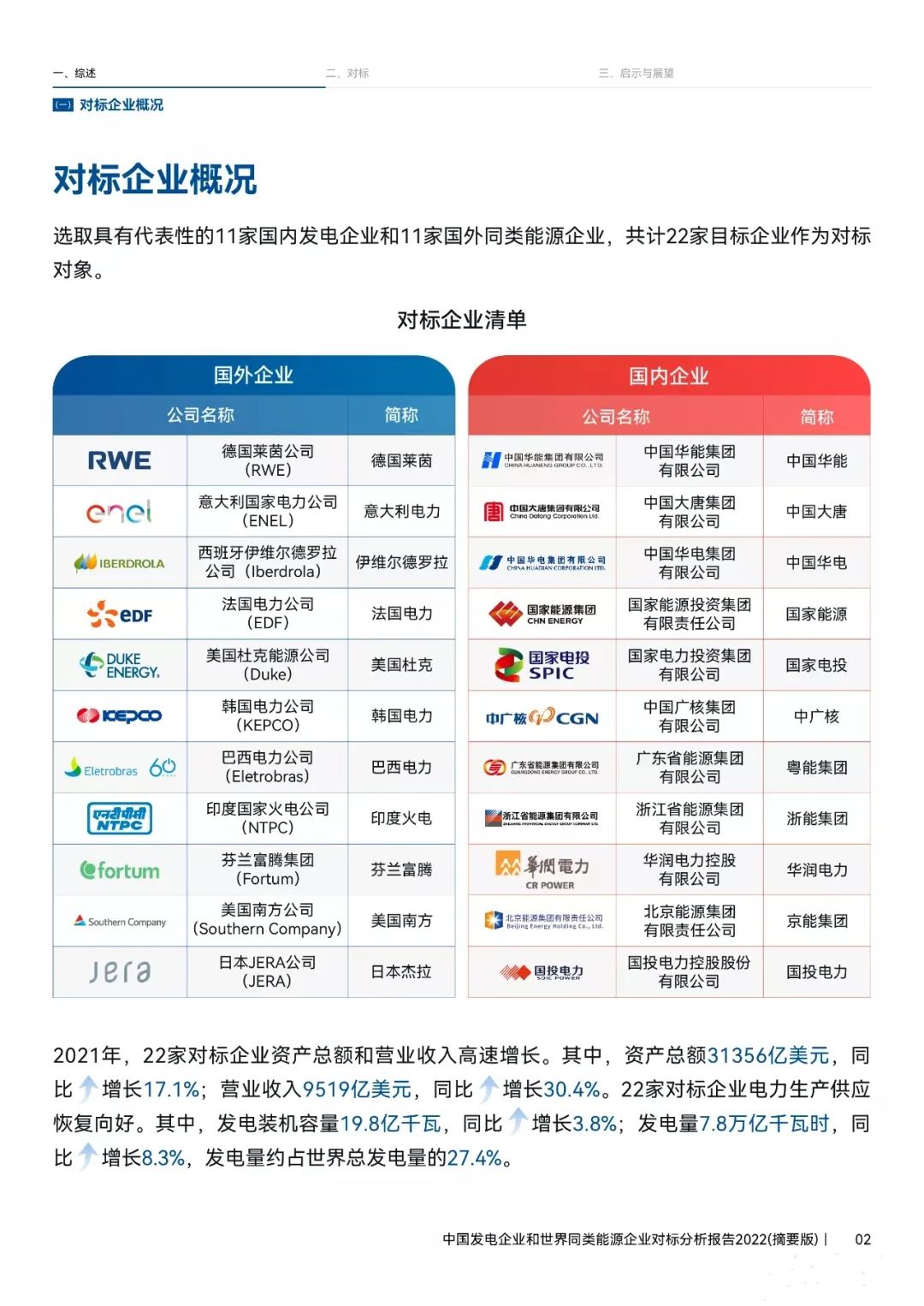 日前中國電力企業(yè)聯(lián)合會(huì)2022 年年會(huì)在海口舉行,中電聯(lián)電力發(fā)展研究院院長張?zhí)旃庠跁?huì)上正式發(fā)布《中國發(fā)電企業(yè)和世界同類能源企業(yè)對(duì)標(biāo)分析報(bào)告2022》,選擇了國內(nèi)11家與國外11家代表性同類企業(yè)進(jìn)行對(duì)比分析!國家能源集團(tuán)在裝機(jī)量、發(fā)電量等指標(biāo)上全球領(lǐng)先,但國內(nèi)發(fā)電企業(yè)的海外營收較全球同行偏低。