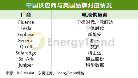 美國(guó)戶(hù)儲(chǔ)以本土品牌為主,中國(guó)供應(yīng)商占比逐步提升。2021年美國(guó)戶(hù)用市場(chǎng)中,Tesla、BYD、Enphase分列前三,國(guó)內(nèi)產(chǎn)業(yè)鏈占比提升。特斯拉采用寧德100ah的方形電池;Enphase采用新能安52ah的軟包電池。