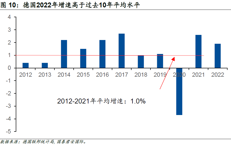 作為歐元區(qū)最大的經(jīng)濟(jì)體,近日公布的數(shù)據(jù)顯示,經(jīng)過價格調(diào)整后,德國2022年GDP同比增長1.9%,高于市場預(yù)期1.8%。不可否認(rèn)的是,俄烏沖突推升的天然氣價格給德國經(jīng)濟(jì)造成了相當(dāng)大的困擾,但是德國2022年GDP依舊增長1.9%,較2019年(新冠疫情開始前一年)高0.7個百分點(diǎn),亦高于2012年至2021年的十年平均水平(1.0%)。
