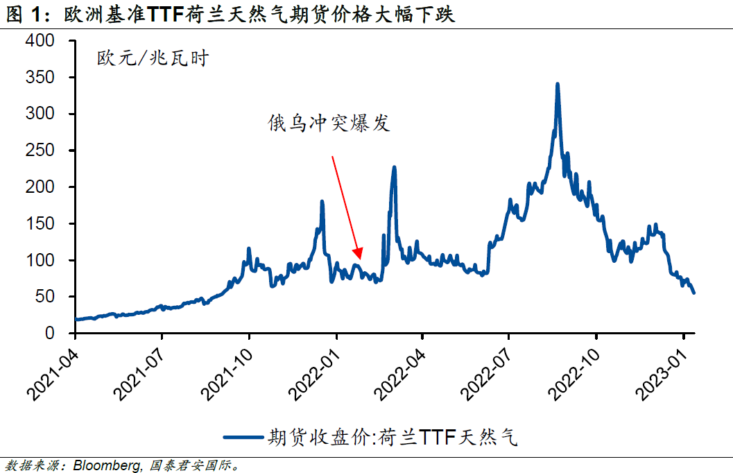 暖冬的到來極大程度上縮減了供熱對天然氣的需求,歐洲基準(zhǔn)TTF荷蘭天然氣期貨價格延續(xù)了之前的大幅回落趨勢。截至2023年1月中旬,期貨價格已經(jīng)低于俄烏沖突爆發(fā)前的水平。在天然氣價格走低的情況下,能源價格不應(yīng)該繼續(xù)推動通脹高企;另一方面,隨著中國2023年經(jīng)濟(jì)預(yù)期的大幅上修,歐元區(qū)出口有望迎來顯著改善。歐洲2023年的衰退預(yù)期似乎也應(yīng)該畫上一個問號?