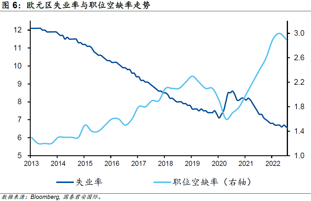 如果說天氣在很大程度上幫助了歐洲人,但歐洲經(jīng)濟(jì)超預(yù)期的根本原因大概率不是因?yàn)樾疫\(yùn)或者天氣。進(jìn)一步來看,勞動力市場的火熱意味著經(jīng)濟(jì)維持著較好的動能。一方面,即使在能源價格高企的去年上半年,職位空缺率都處于上行趨勢中;另一方面,在緊張的企業(yè)用工環(huán)境中,歐元區(qū)的失業(yè)率開始走低,并迭創(chuàng)歷史低點(diǎn)。在之前通脹大幅高走的背景下,歐元區(qū)多個國家的工會已經(jīng)通過罷工的形式確定了未來的漲薪方案。與此同時,歐洲央行(ECB)基于通脹補(bǔ)償?shù)目紤],在2022年12月的最新預(yù)測中將2022-2024年的累積工資增長較2022年9月的預(yù)測值上調(diào)1.4個百分點(diǎn)。