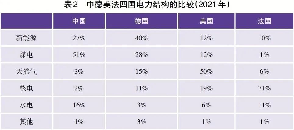 從表2中可以看出,中國(guó)與德國(guó)的電力結(jié)構(gòu)有更多的相似之處,主要都是可再生能源與煤電占比較高。而美國(guó)主要依賴天然氣發(fā)電,法國(guó)則以核電為主。因此,德國(guó)的實(shí)踐經(jīng)驗(yàn)對(duì)于中國(guó)可能會(huì)具有更高的參考價(jià)值。