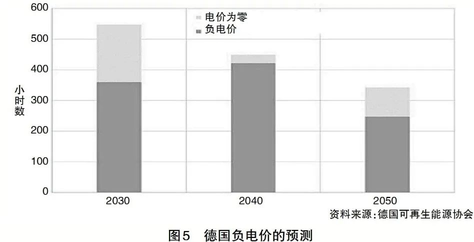 然而,負(fù)電價(jià)問(wèn)題在德國(guó)能源市場(chǎng)中仍然持續(xù)存在。盡管德國(guó)對(duì)傳統(tǒng)電廠進(jìn)行了系統(tǒng)化靈活性改造,但按照德國(guó)可再生能源協(xié)會(huì)的預(yù)測(cè),到2030年德國(guó)仍將面臨300多小時(shí)的負(fù)電價(jià)情況,且這種狀況有可能直到2050年仍將維持在相同的水平(詳見(jiàn)圖5),主要原因是能源系統(tǒng)的靈活性仍未能達(dá)到要求,盡管預(yù)期將有大規(guī)模的儲(chǔ)能和靈活負(fù)荷投入使用。