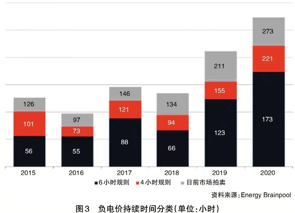 德國(guó)的研究發(fā)現(xiàn),負(fù)電價(jià)以持續(xù)6小時(shí)居多。因此,德國(guó)政府制定了相應(yīng)的限制措施,例如,如果現(xiàn)貨市場(chǎng)價(jià)格出現(xiàn)長(zhǎng)達(dá)6小時(shí)或更長(zhǎng)時(shí)間的負(fù)電價(jià),可再生能源的市場(chǎng)及管理補(bǔ)貼將會(huì)被取消。而法國(guó)對(duì)于負(fù)電價(jià)持續(xù)的時(shí)間上限規(guī)定則是20小時(shí)。(見(jiàn)圖3)