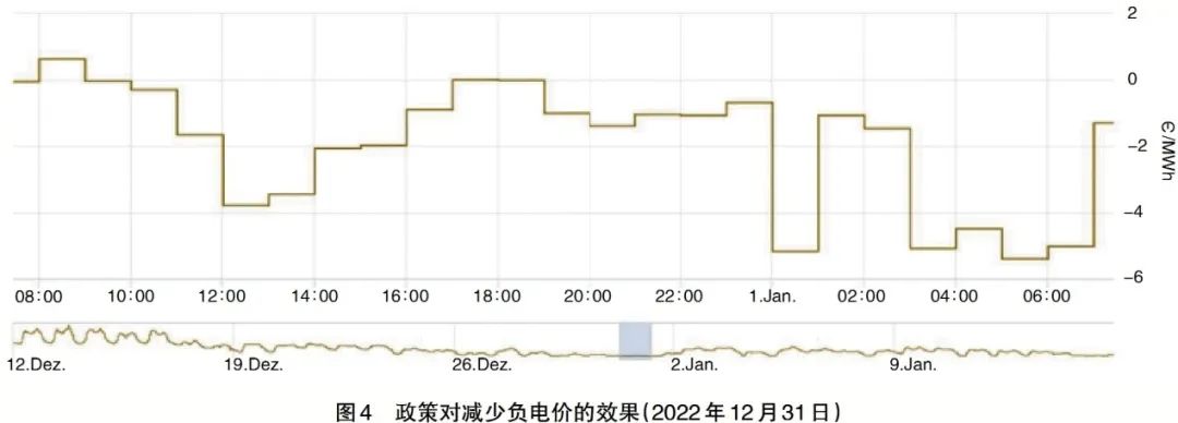 到2023年初,為避免負(fù)電價(jià)超過(guò)規(guī)定時(shí)間,可再生能源運(yùn)營(yíng)商開(kāi)始采取預(yù)防性減少發(fā)電量,以免失去市場(chǎng)和管理補(bǔ)貼。這一現(xiàn)象進(jìn)一步證實(shí),政策的靈活性對(duì)于減少負(fù)電價(jià)起到了明顯的作用(詳見(jiàn)圖4)。