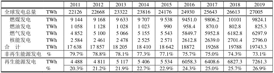 電力可來自非再生能源發(fā)電和再生能源發(fā)電。表中2010~2015年數據來自國際能源署(IEA)《Key world energy statistics》報告的數據,而2016~2019年的數據來自《BP Statistical Review of World Energy June 2017-2020》。