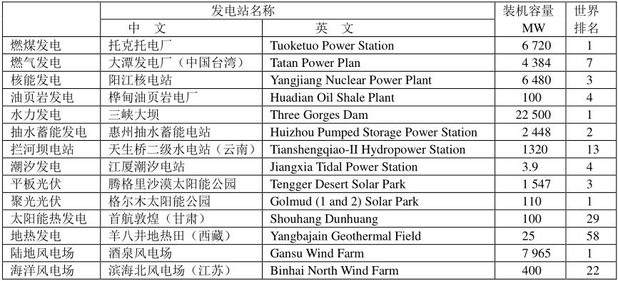 全球前20位發(fā)電站的順序是隨著時間而變化的,下表是最新的排序。目前全球20席中,中國占有六席:水力發(fā)電占有4席:三峽大壩、溪洛渡大壩、向家壩和龍灘大壩;燃煤發(fā)電占一席:托克托電廠;核能發(fā)電占一席:陽江核電站。