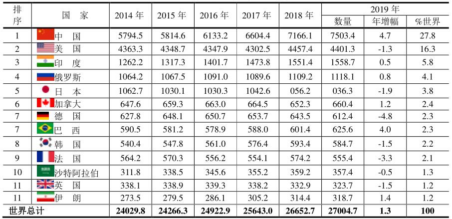 2014~2019年主要國家的發(fā)電量(單位:TWh)