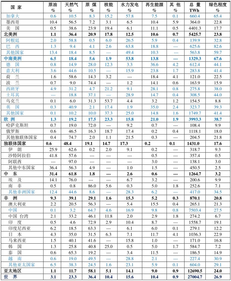 本資料根據BP 2020年報告的數據,再經過計算而成。本文所指的化石燃料是原油、天然氣和原煤構成;非再生能源由化石燃料和核燃料構成。綠色能源由水力發(fā)電、再生能源和“其他”構成。“其他”指抽水蓄能、城市廢物發(fā)電等。綠色程度為水力發(fā)電、再生能源和“其他”的水力發(fā)電、再生能源和“其他”的%之和,用%表示。表中藍色表示這些國家綠色程度超過了世界平均值26.9%。