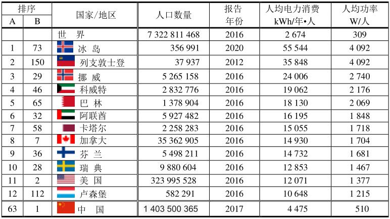 表中:A—表示人均能源和電力消費最多的排序;B—表示該國電力產量的世界排序。