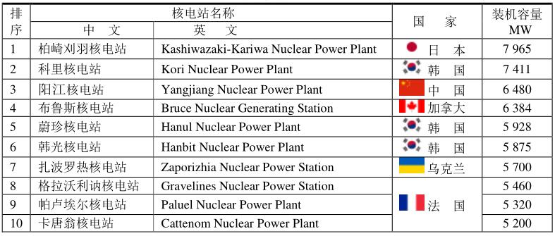 世界上最大的核電站是日本柏崎刈羽核電站,裝機容量為7965MW,但2011年已經停工。值得注意的是韓國核電站進展很快,前十位核電站就占有3席,把美國和日本都摔到后面。