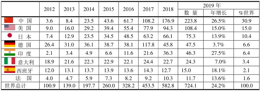 根據(jù)BP 2020的報告,2019年全球太陽能發(fā)電占全球發(fā)電總量的724.1/27004.7=2.7%,占再生能源發(fā)電總量的724.1/7261.3=10.0%,其份額較少,但進展較快。