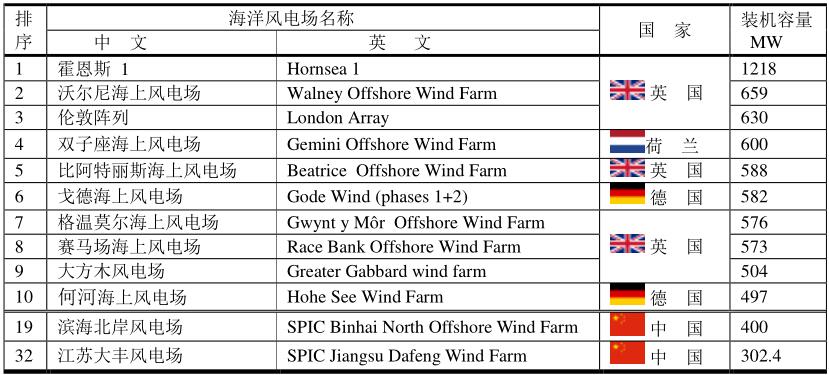 海洋最大的風(fēng)電場在英國倫敦陣列。中國最大的海上風(fēng)電場是濱海北岸風(fēng)電場(SPIC Binhai North Offshore Wind Farm),世界排序19,裝機容量400MW。SPIC是State Power Investment Corporation(國家電力投資公司)的縮寫。