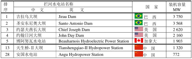 全球徑流式水電站第一位是巴西的“吉拉烏大壩”,美國的“約瑟夫酋長大壩”已經(jīng)從第一位降低到第三位。中國最大的徑流式水電站是天生橋-Ⅱ大壩,世界排序13,裝機容,1320MW。