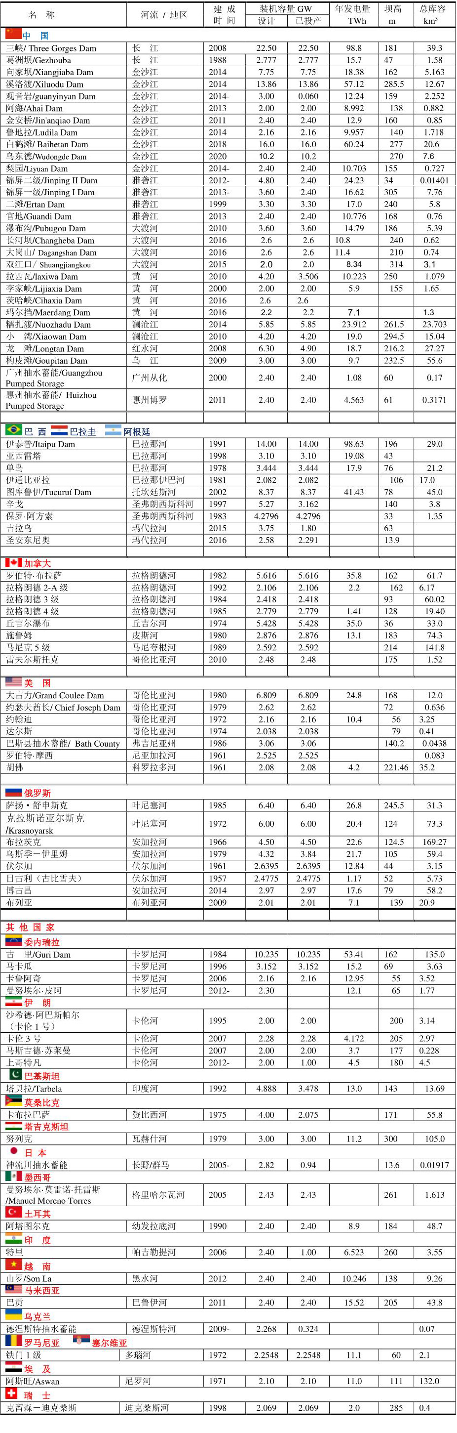 2020年裝機容量2GW以上的水電站