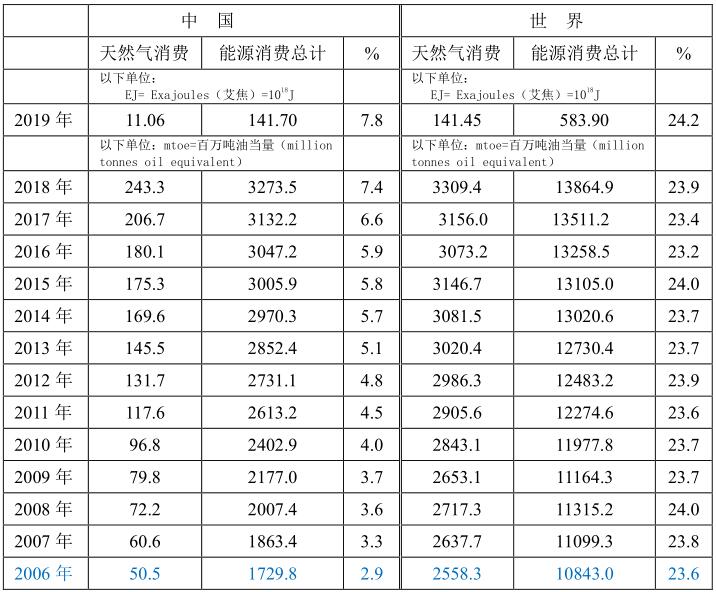 天然氣消費(fèi)量是指本國天然氣產(chǎn)量和進(jìn)口量之和。中國于2006年開始LNG國際貿(mào)易,2010年管輸國際貿(mào)易開始,因此從下表可以看出,2006年中國天然氣剛開始進(jìn)口,消費(fèi)量僅占世界天然氣消費(fèi)總量的2.1%,但隨著LNG和管輸國際貿(mào)易以來,中國天然氣消費(fèi)量僅占世界天然氣消費(fèi)總量的比例(%)逐年增加,到2019年中國天然氣消費(fèi)占世界消費(fèi)總量的比例已經(jīng)達(dá)到7.8%。