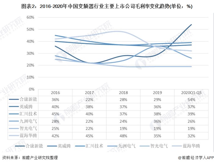 從我國上市公司近幾年的毛利率變化來看,變頻器行業(yè)主要上市公司的毛利率略有下降,但是整個行業(yè)的獲利水平較高,經(jīng)營效益良好。2018年,6家上市公司的毛利率維持在20%-50%之間;2019年,各公司的毛利率差異進一步縮小,集中在30%-40%之間。2020年前三個季度,各公司的毛利率依然多集中在30%-40%之間。
